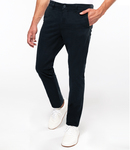 98% cotton twill/2% elastane. Enzyme washed. Modern style. Flat front. Belt loops. Zip fly with button over. Two side pockets. Ticket and coin pocket. Rear piped pockets.